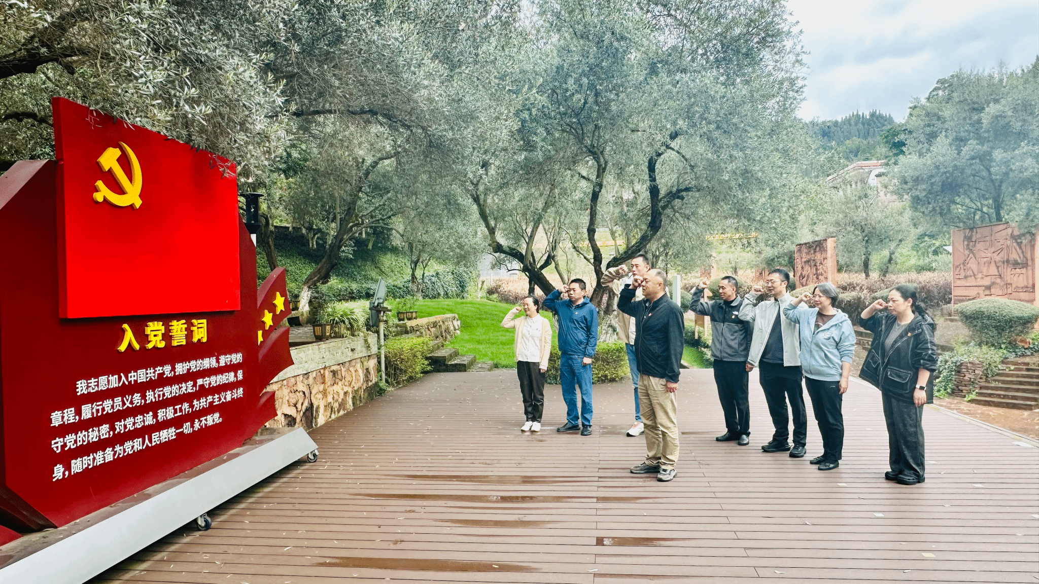 在林场放映厅,大家共同观看了林场纪录片《守望幸福林》了解林场发展历史,学习林场职工不忘初心、艰苦奋斗的红色精神。观影结束,全体人员参观了油橄榄林,1964年周总理来到海口林场亲手种下第一棵油橄榄树,它见证了海口林场的发展与成长,大家驻足在油橄榄树下,深刻领会“绿水青山就是金山银山”的生态理念。在周总理亲植的油橄榄树下,支部全体党员面向党旗,在支部书记熊雁兵同志带领下重温了入党誓词。